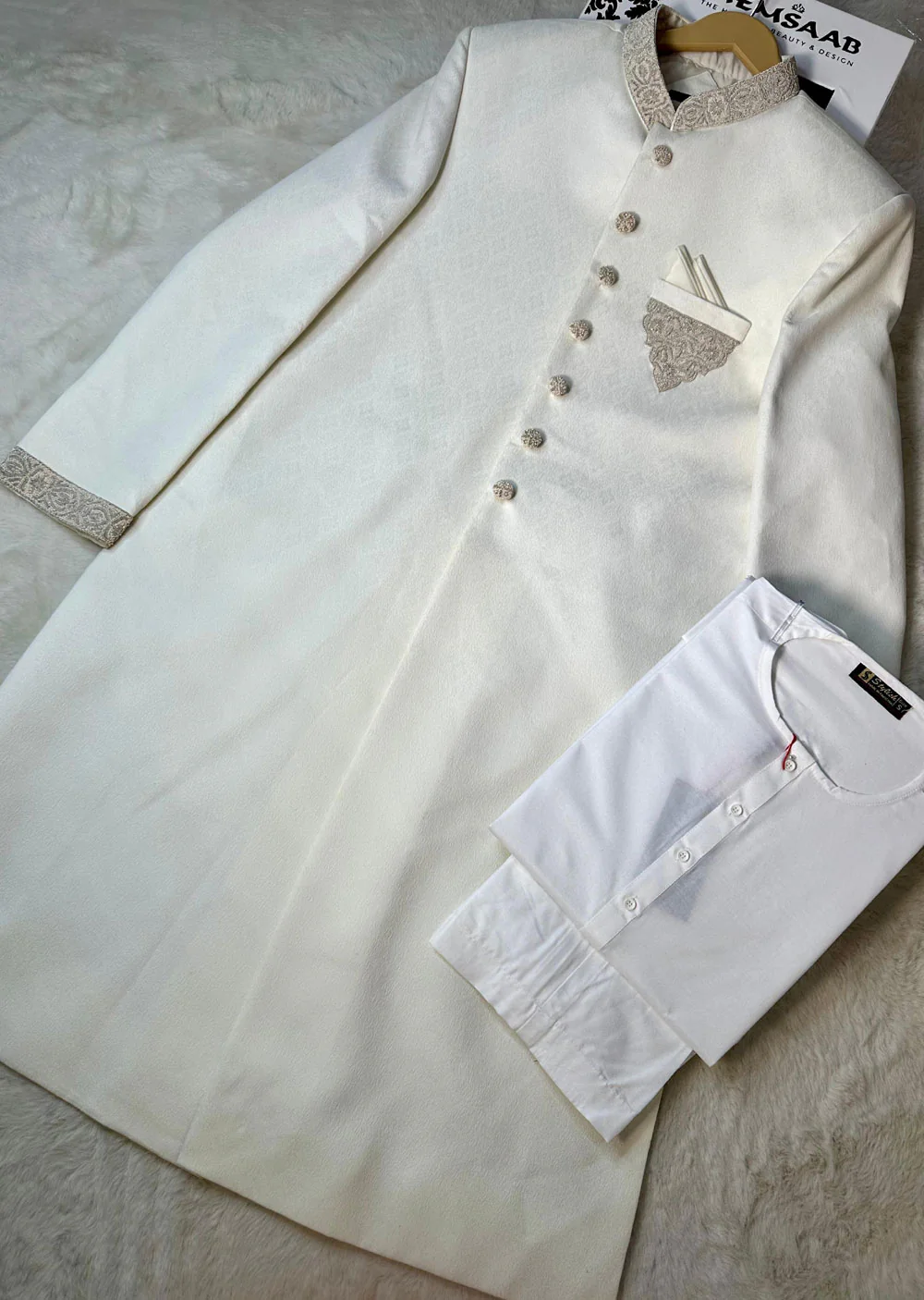 September 18, 2025Embrace unparalleled luxury in this premium white brocade sherwani, meticulously crafted with exquisite handwork adorning the neckline, sleeves, and pocket. Designed for the discerning gentleman, this ensemble radiates elegance and grandeur, making it the perfect choice for weddings, galas, and other milestone celebrations. The set includes a complementary inner kameez and tailored trousers for a complete, sophisticated look.